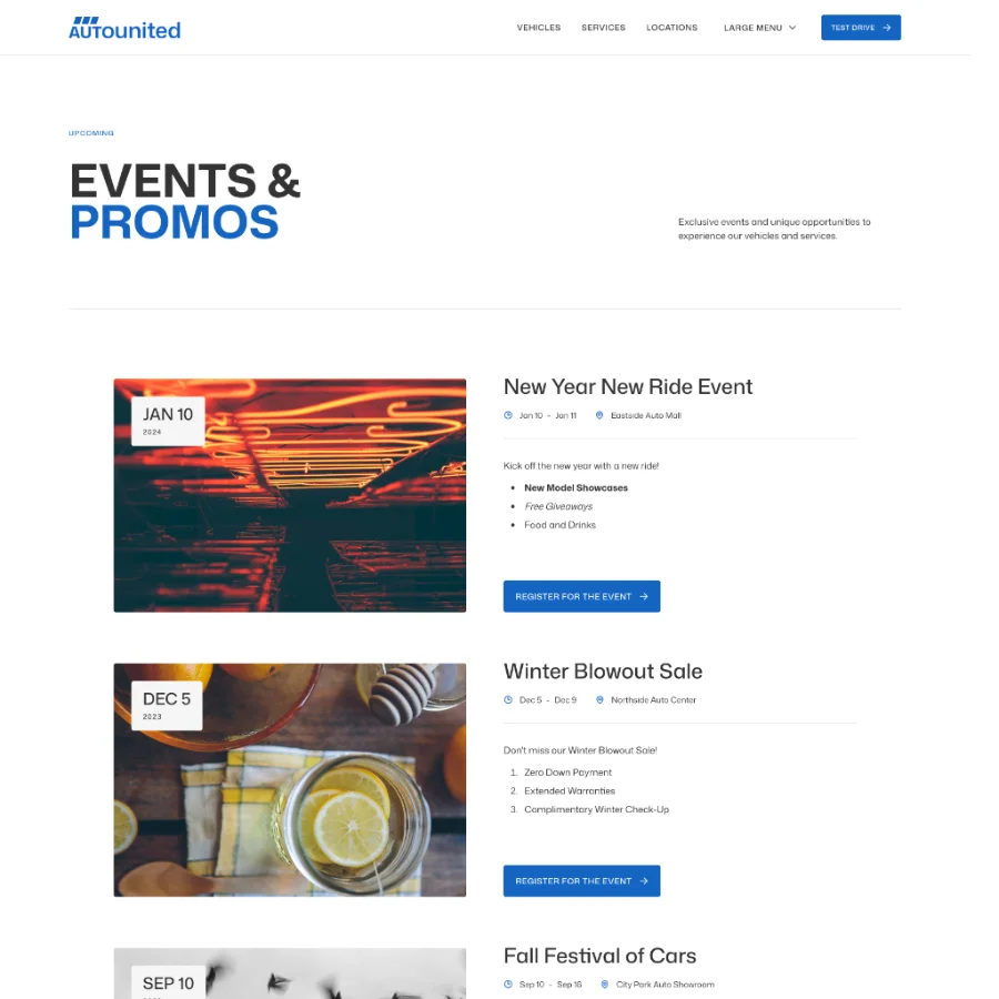 The site also includes sections for dealership services, multiple locations, and events, making it suitable for both single-location dealerships and larger networks. Calls to action are placed throughout the site to encourage users to browse vehicles, contact the dealership, or book a test drive through an external system.