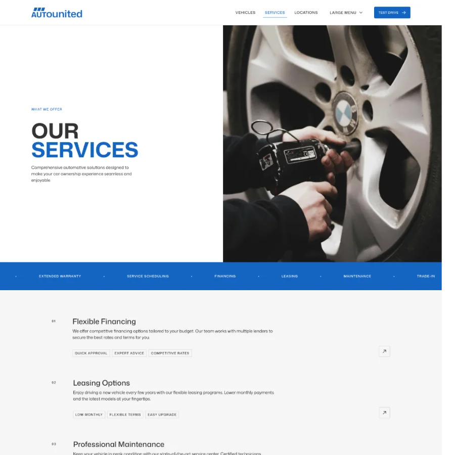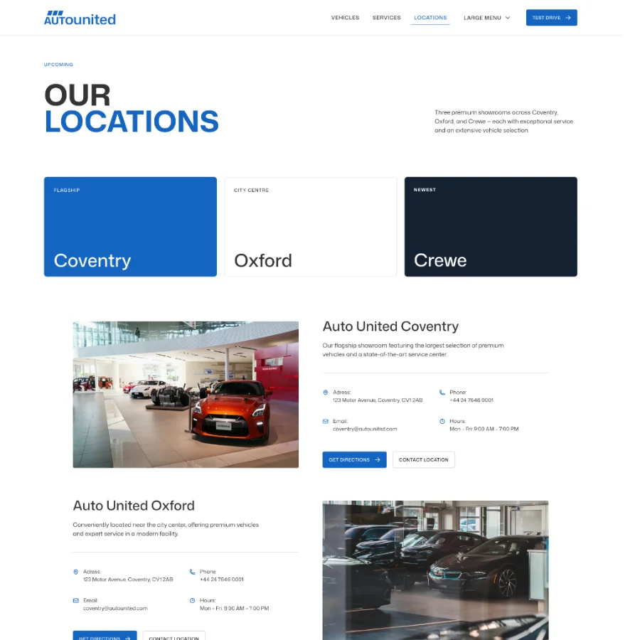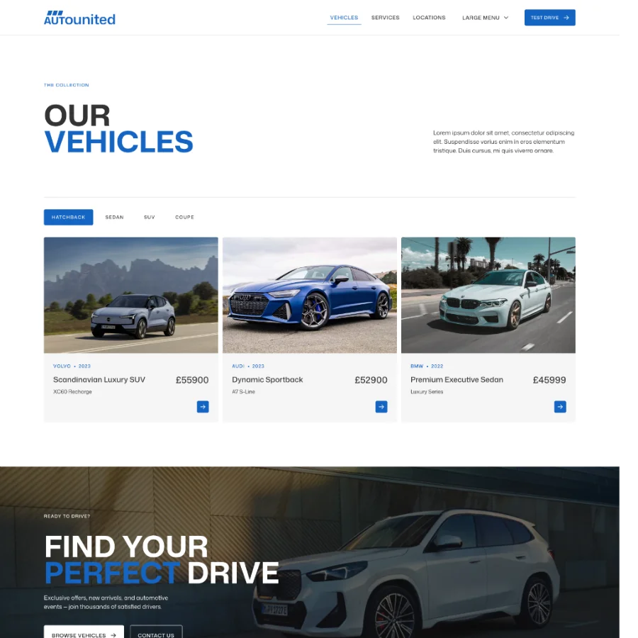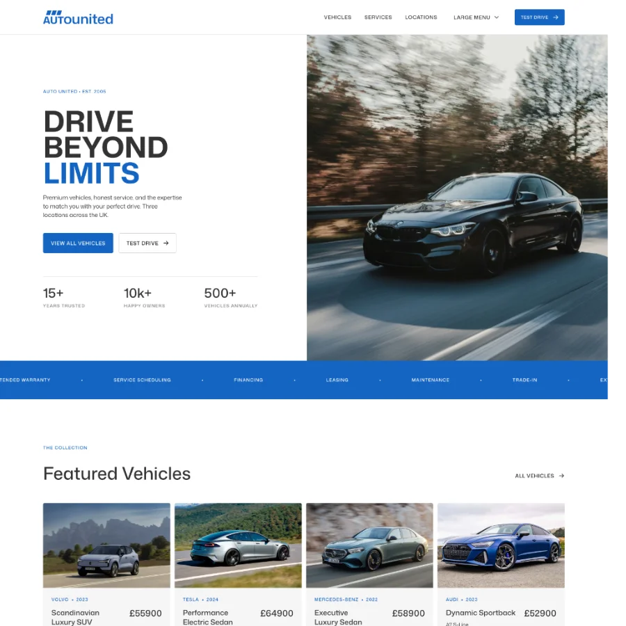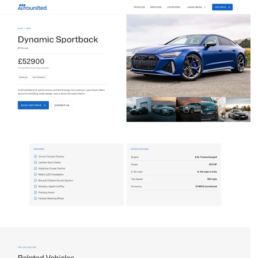Auto United focuses on presenting vehicles in a clear and engaging way, with structured layouts for specifications, features, pricing, and imagery. The vehicle pages are designed to give potential buyers all the information they need while keeping the experience simple and intuitive.