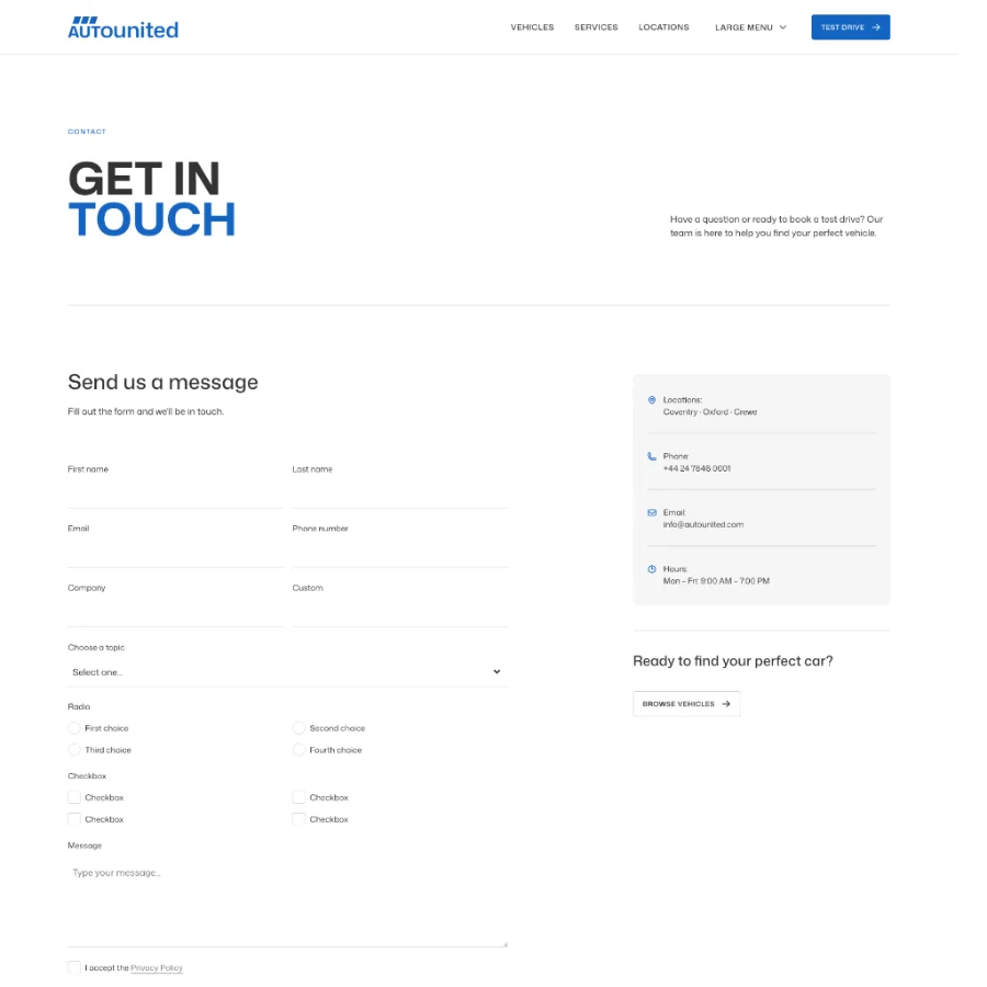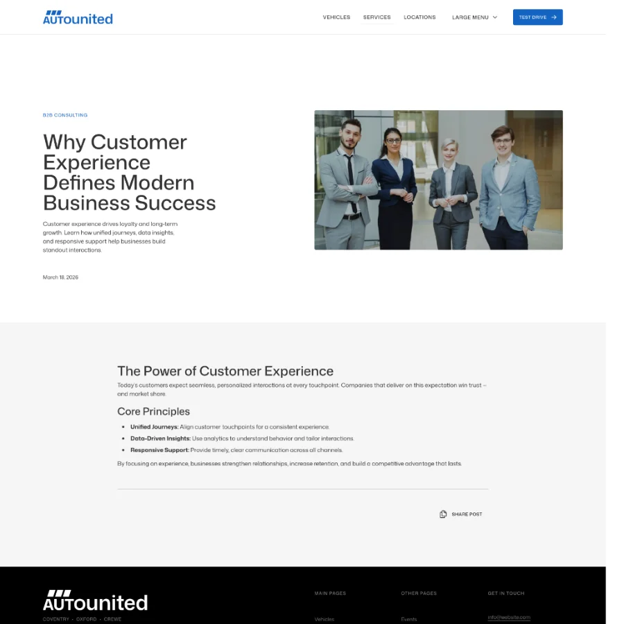 The starter includes dedicated pages for vehicle listings, individual vehicle pages, services, locations, events, and news. Each section is designed to guide users through the buying journey — from discovering vehicles to getting in touch or booking a test drive.