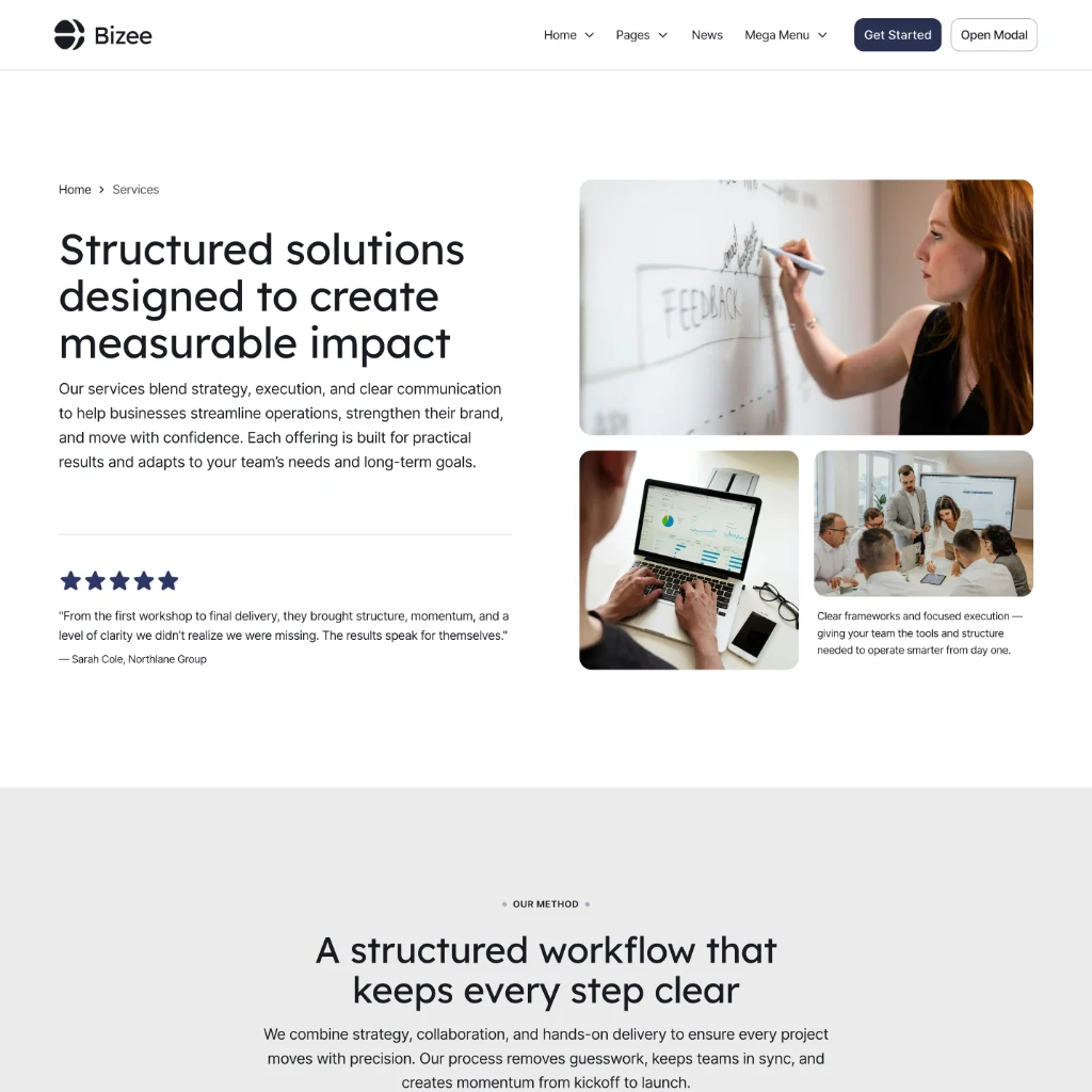 Bizee is designed to scale as your company grows. The modular layout structure allows you to easily duplicate sections, adapt page layouts, and expand the website with additional content.