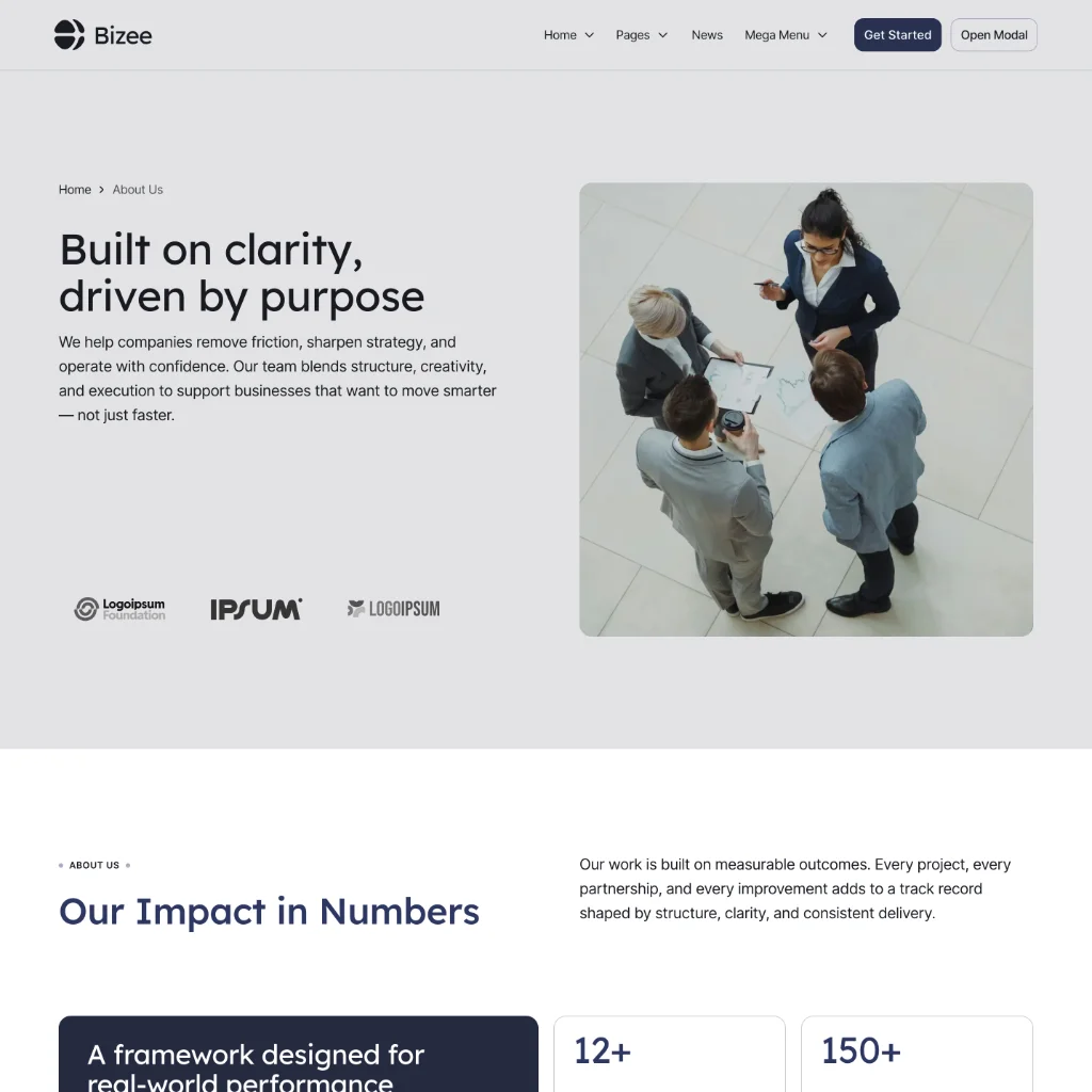 Bizee is a clean and structured corporate starter site designed for companies, agencies, and consultants who need a professional online presence. The layout focuses on clarity, hierarchy, and usability, making it easy to present services, company information, and key offerings in a confident and organized way.