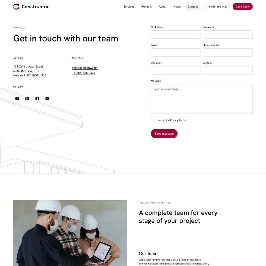 The site structure works equally well for smaller contractors and larger construction companies with multiple projects and teams. Clear calls to action throughout the site make it easy for visitors to get in touch and start new projects.