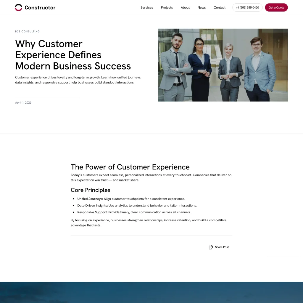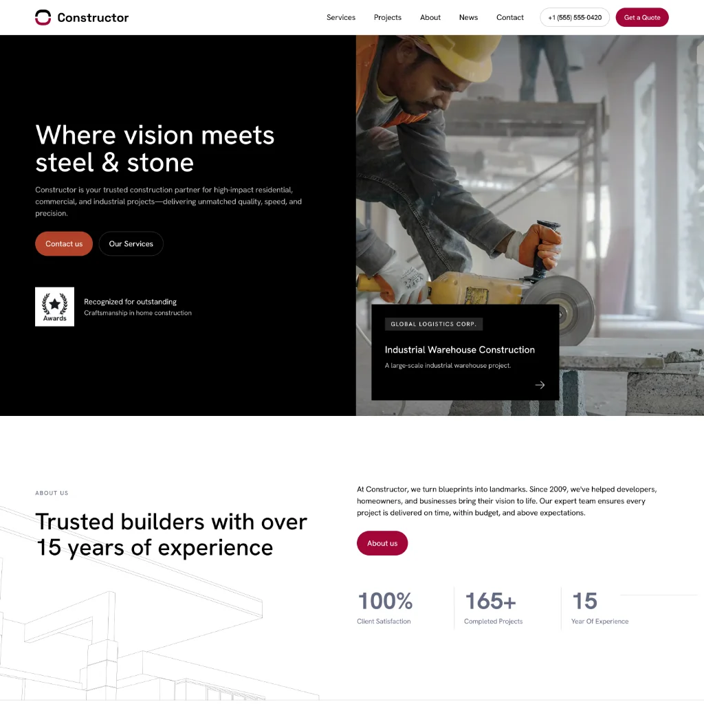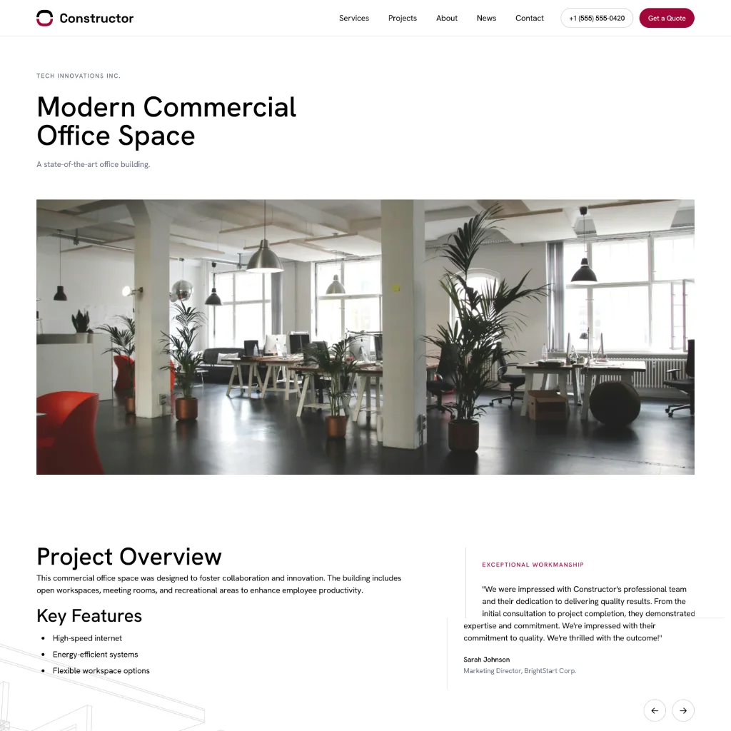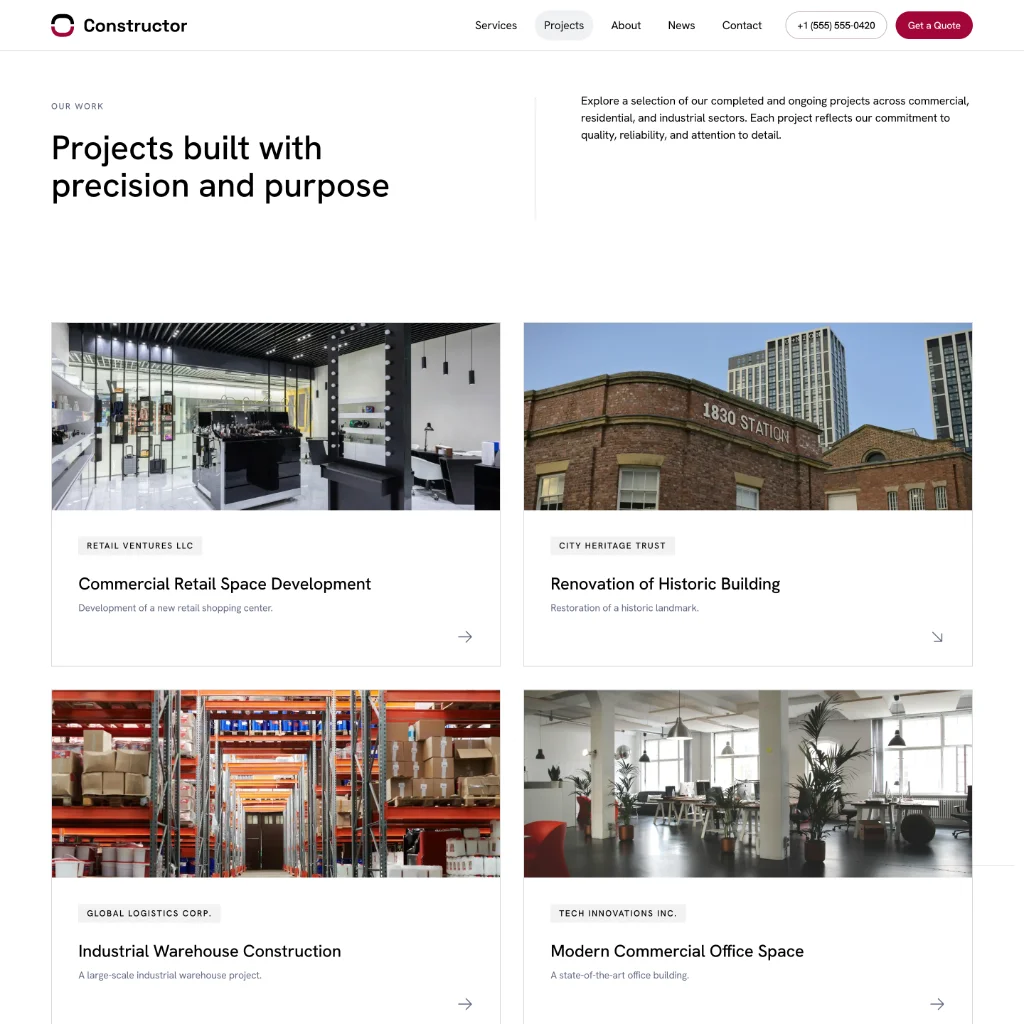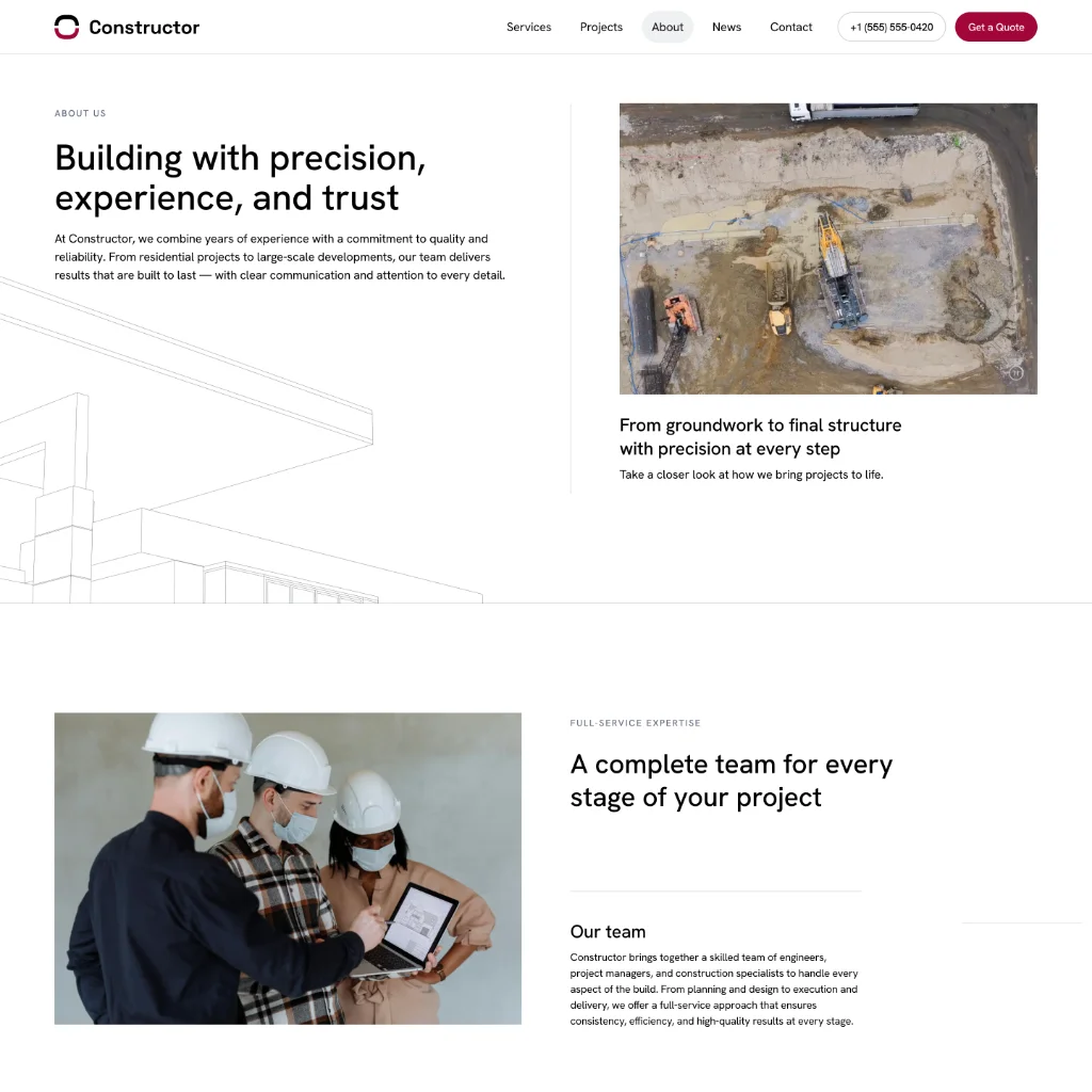 Constructor is designed to present construction work in a clear and professional way. Project pages highlight details, scope, and results, while supporting sections for services, team, and company information help reinforce trust and reliability.