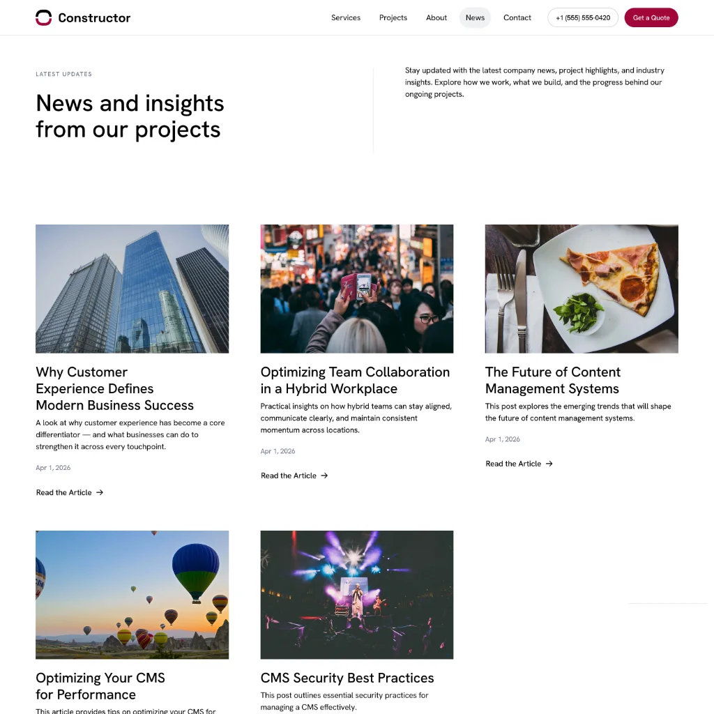 Constructor is a clean and structured starter site designed for construction companies, contractors, and development firms. The layout focuses on presenting services, showcasing completed projects, and building trust through clear communication and professional design.