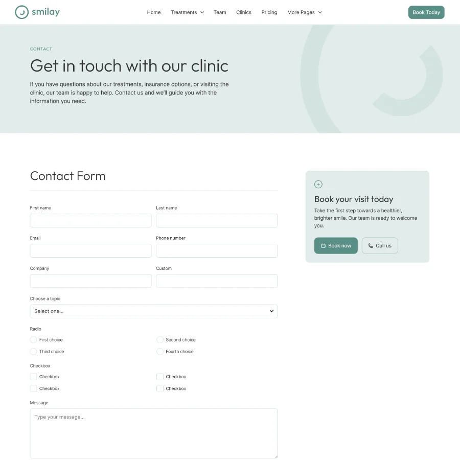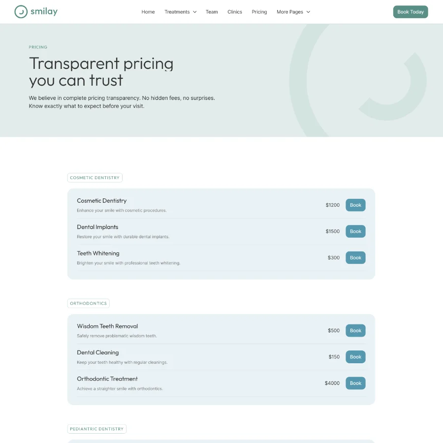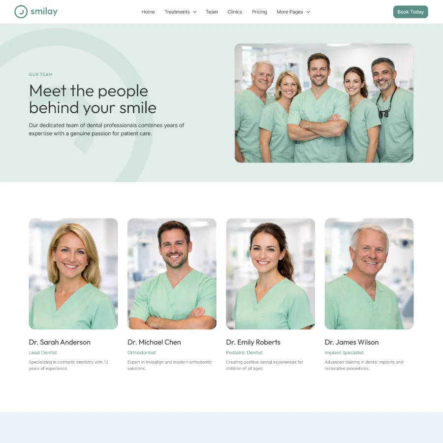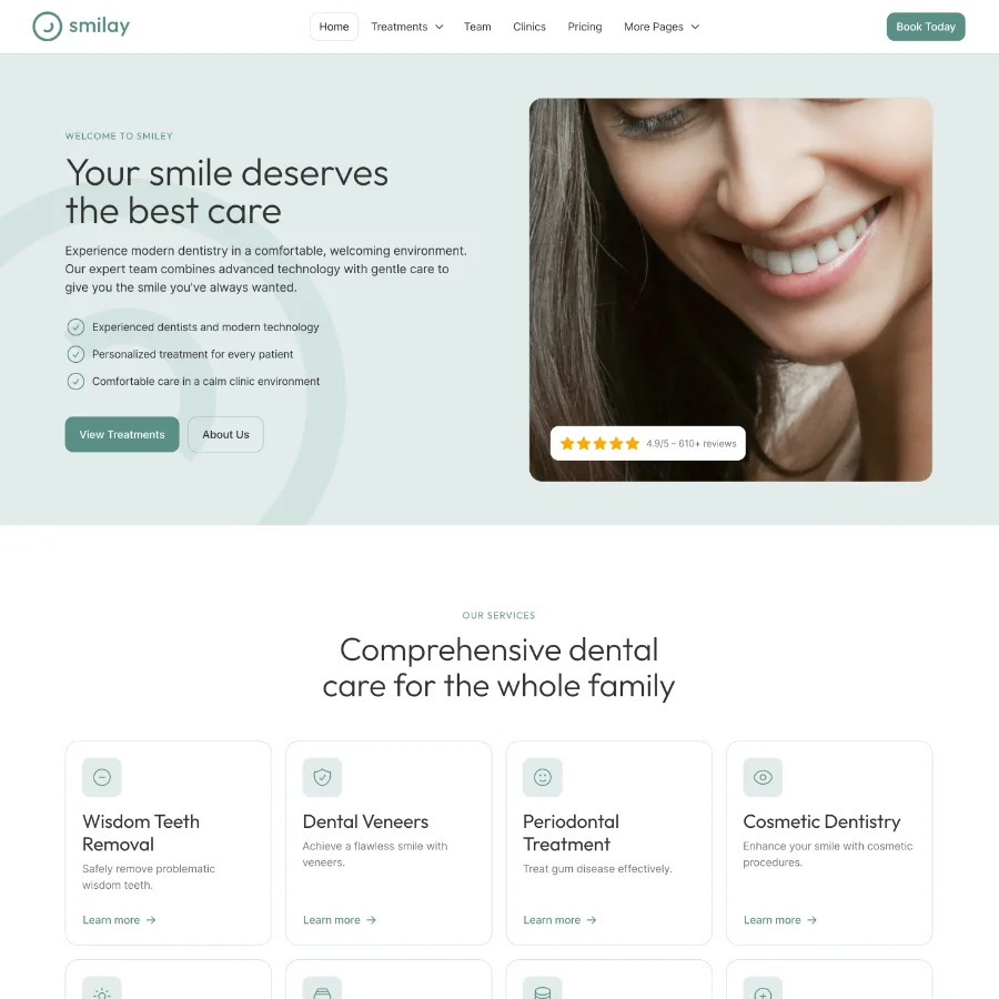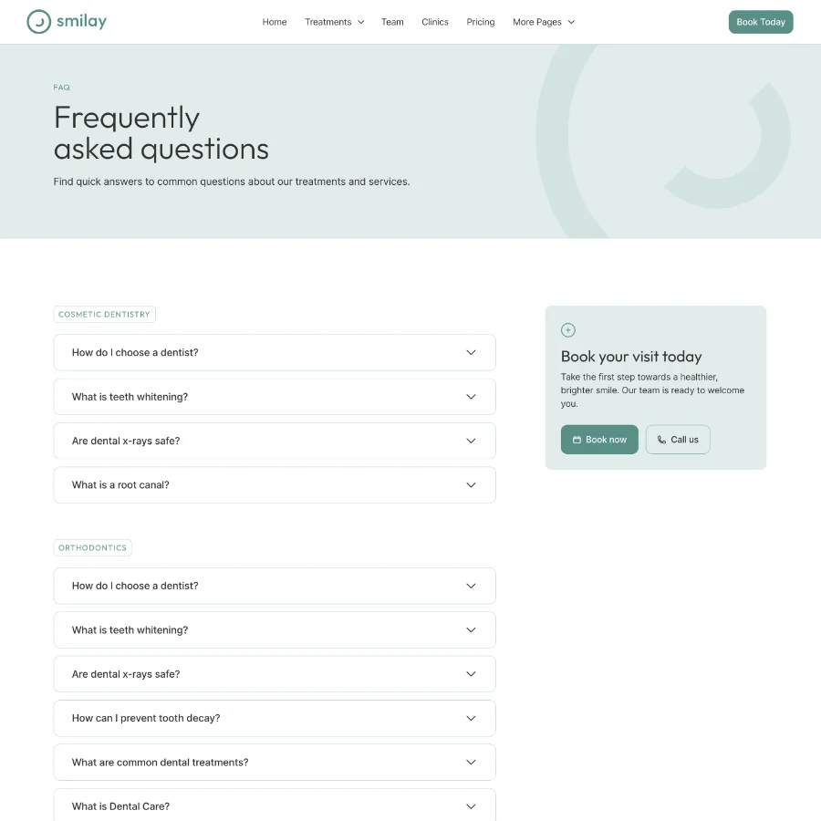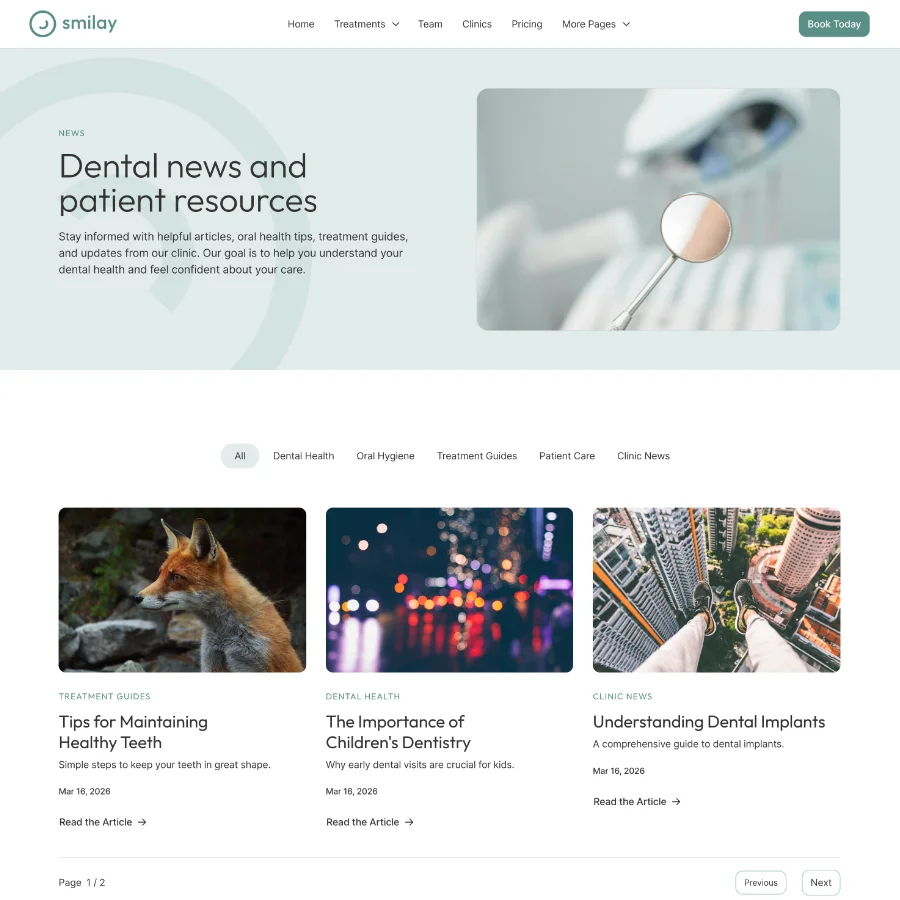 Smilay includes CMS-powered collections for treatments, frequently asked questions, and news articles. This makes it easy to keep your website updated with dental care information, treatment explanations, and clinic updates.