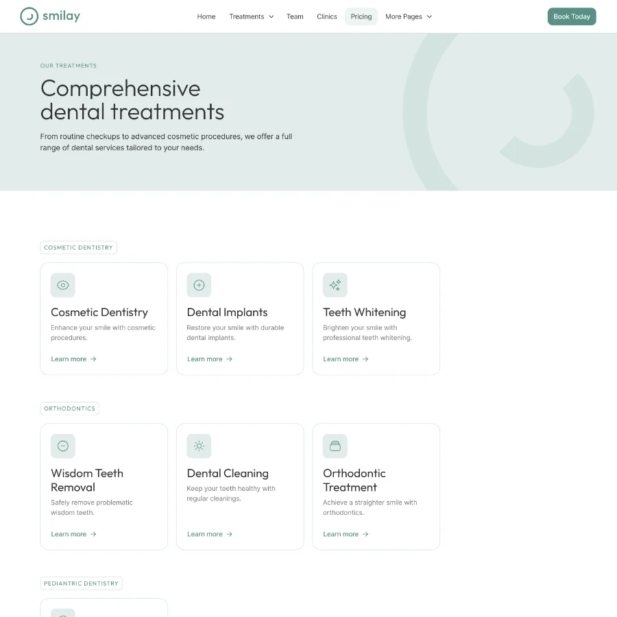 Smilay is a clean and structured starter site designed for dental clinics, healthcare practices, and medical professionals who want a professional and trustworthy online presence. The design focuses on clarity, patient-friendly communication, and easy access to important information such as treatments, clinic locations, and dental care resources.