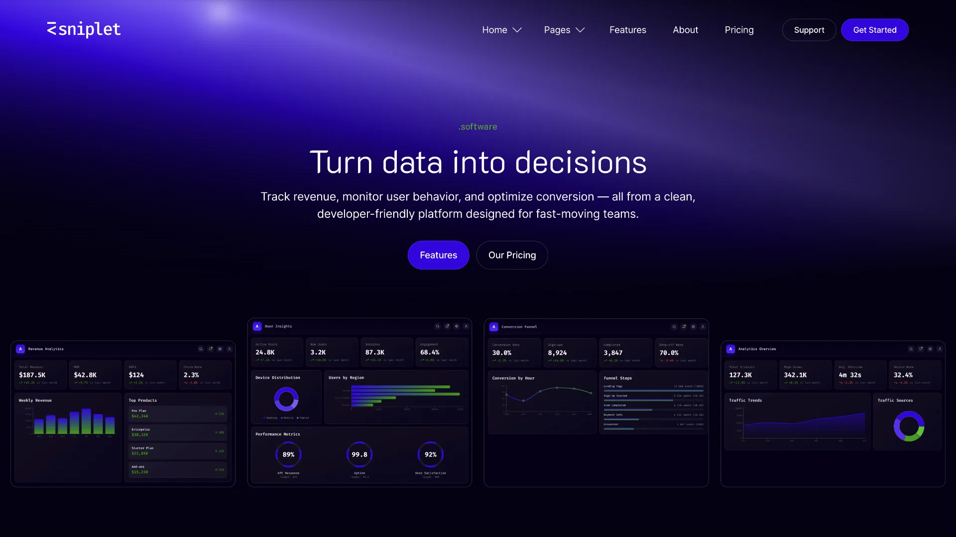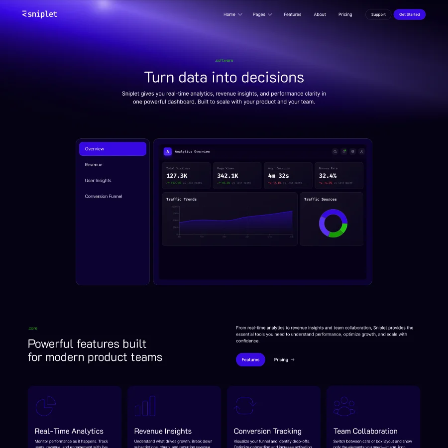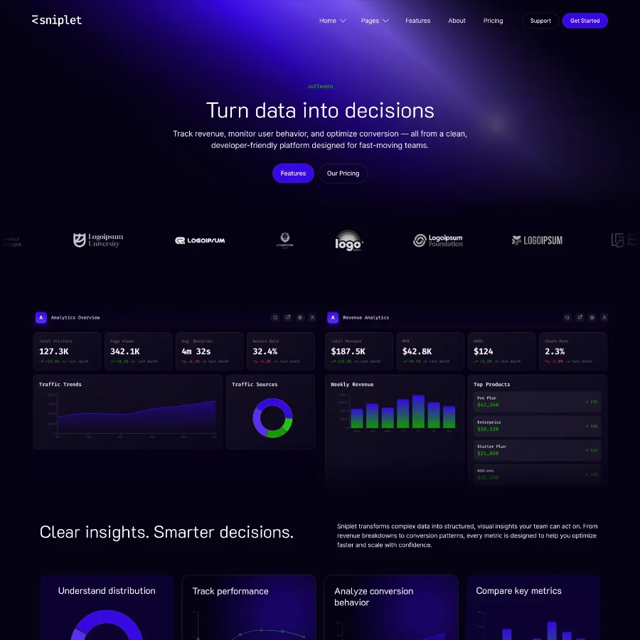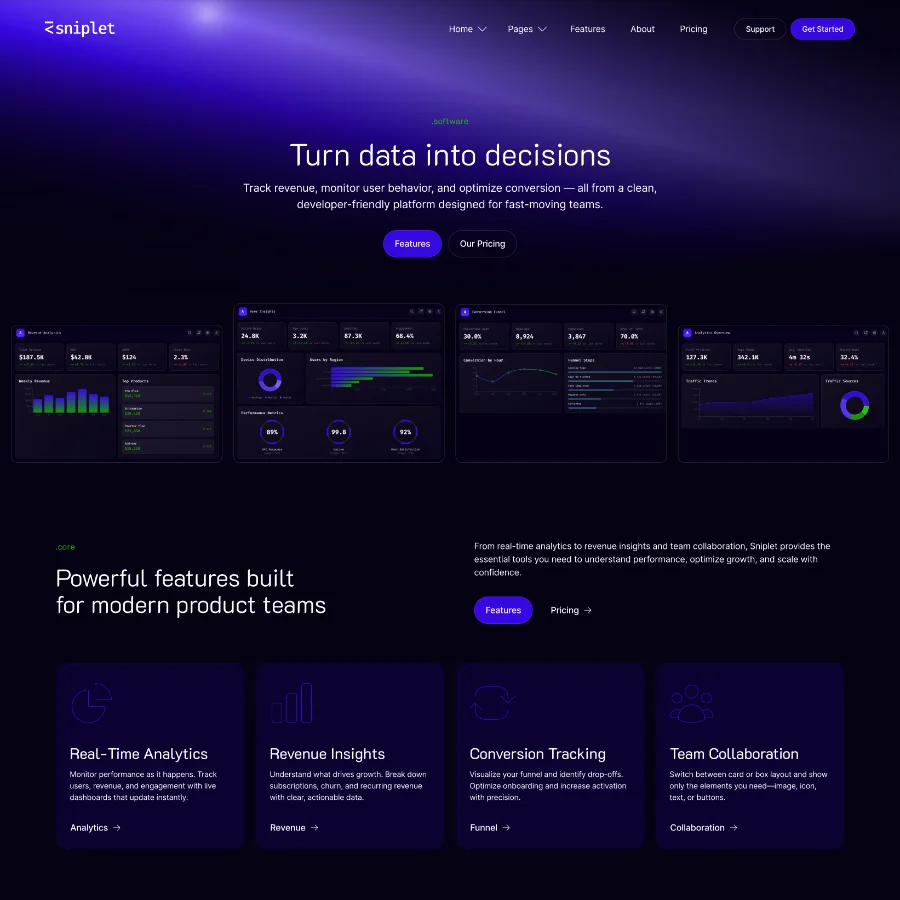 Whether you’re launching a new SaaS platform, presenting a developer tool, or building a product marketing site, Sniplet provides a flexible starting point for creating a modern, data-driven software website.