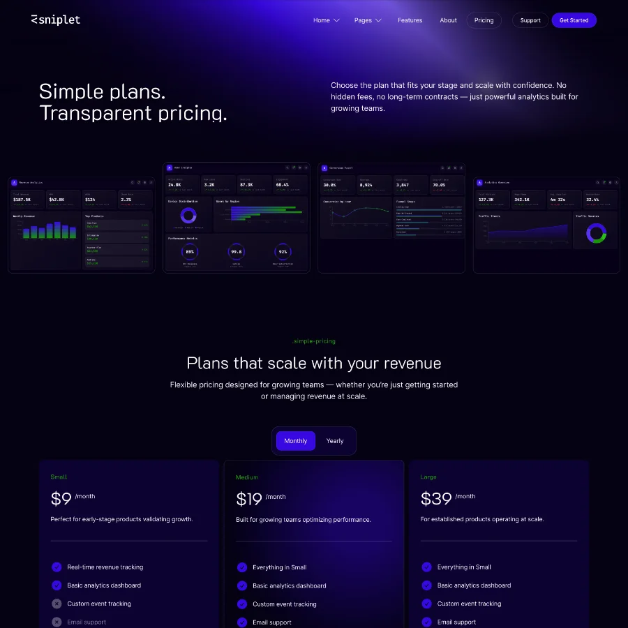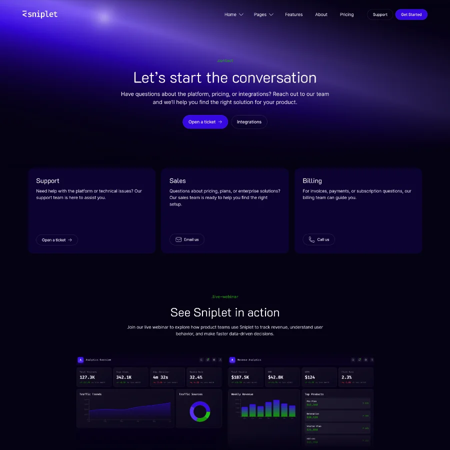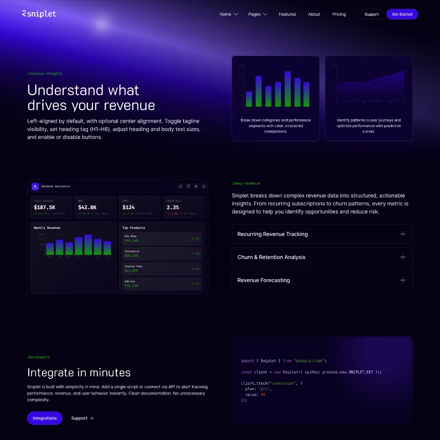 Sniplet also features interface-driven layouts with dashboard previews such as analytics overview, revenue insights, conversion funnels, and product metrics. These visual sections make it easy to demonstrate how your software works and highlight the benefits of your platform.